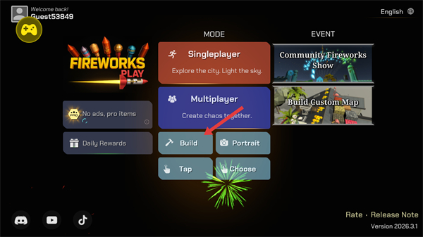 1、进入【Fireworks-Play】游戏主界面,点击【Build】按钮,进入烟花搭建创作模式。