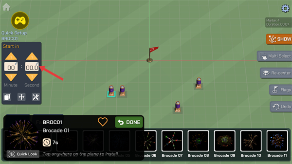 2、在搭建界面,选择烟花样式并放置到网格场景,可调整【Start-in】时间设置燃放时机。