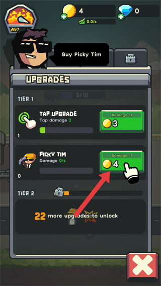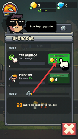 2、在升级页,花费2金币购买【TAP-UPGRADE】,提升单次点击伤害。