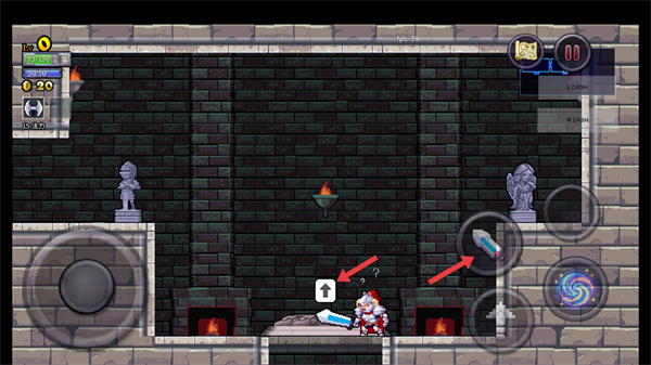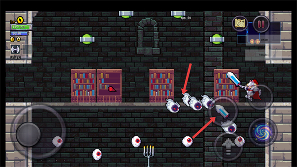 1、进入图书馆场景,操控角色点击剑形攻击按钮,击败白色眼球怪物,清理前进道路。