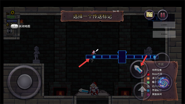 3、打开地图界面,查看蓝色传送标记点位,选择目标传送点,快速穿梭地牢场景。