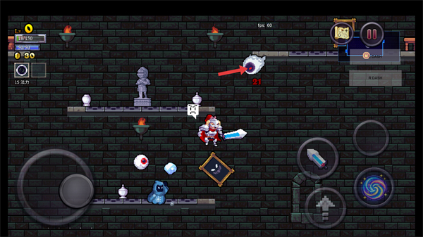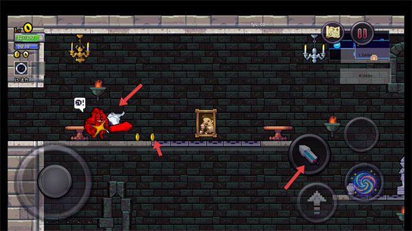 2、遇到红色怪物时,点击【右侧剑形】攻击按钮,挥剑击败敌人并拾取金币,提升资源储备。