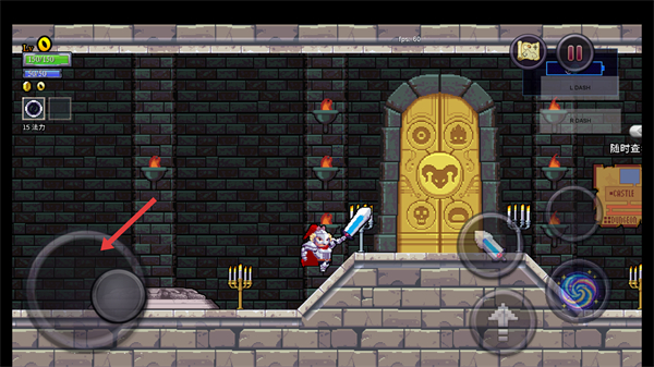 1、进入地牢关卡,点击【左侧】虚拟摇杆操控角色移动,熟悉界面操作与场景布局。