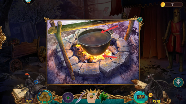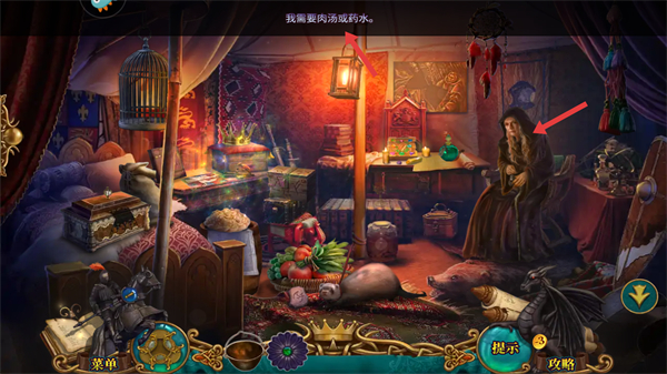1、进入帐篷场景,根据提示【我需要肉汤或药水】,明确需要制作的道具。
