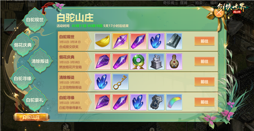 繁花映江湖,好礼赠侠士。为庆贺新资料片上线,五大福利活动同步开启,海量奖励免费相送!活动期间,侠士登录游戏即可在“白驼豪礼”界面直接领取专属赠礼;“白驼现世”“白驼寻缘”活动同步上线,参与即可获取高阶养成材料,更有机会抽取稀有大奖。“清除叛徒”玩法激战不停,参与即得丰厚战利品;每晚帮会领地还将举办烟花庆典,与兄弟共赏烟火可领取大量经验,更能寻找随机刷新的庆典宝箱,解锁意外惊喜!